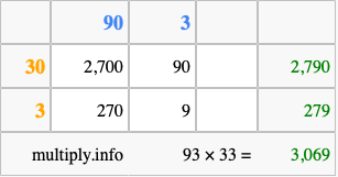 Below is an illustration showing you how to calculate 93 times 33 using the box method, using the instructions above.