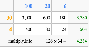 Finally, we add up all the sums we found in step 3 to get our final answer to 126 times 34.