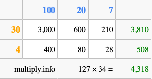 That's all there is to it! As you can see from the box above, the answer to 127 times 34 using the box method is 4,318.