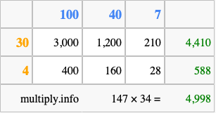 That's all there is to it! As you can see from the box above, the answer to 147 times 34 using the box method is 4,998.