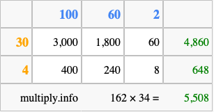 Finally, we add up all the sums we found in step 3 to get our final answer to 162 times 34.