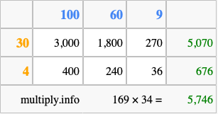 That's all there is to it! As you can see from the box above, the answer to 169 times 34 using the box method is 5,746.
