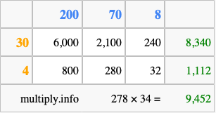 Finally, we add up all the sums we found in step 3 to get our final answer to 278 times 34.