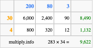 That's all there is to it! As you can see from the box above, the answer to 283 times 34 using the box method is 9,622.