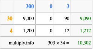 Finally, we add up all the sums we found in step 3 to get our final answer to 303 times 34.