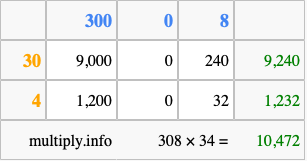 Finally, we add up all the sums we found in step 3 to get our final answer to 308 times 34.