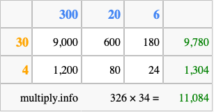 Below is an illustration showing you how to calculate 326 times 34 using the box method, using the instructions above.