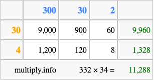 Below is an illustration showing you how to calculate 332 times 34 using the box method, using the instructions above.