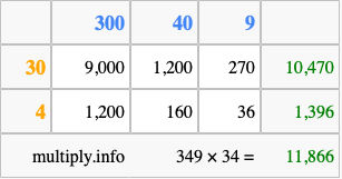 Below is an illustration showing you how to calculate 349 times 34 using the box method, using the instructions above.