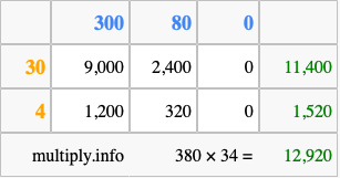 Finally, we add up all the sums we found in step 3 to get our final answer to 380 times 34.