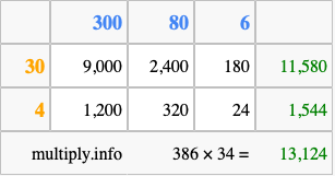 Finally, we add up all the sums we found in step 3 to get our final answer to 386 times 34.