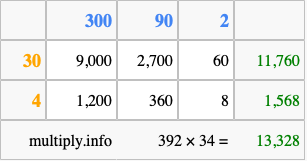 Finally, we add up all the sums we found in step 3 to get our final answer to 392 times 34.