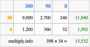 Finally, we add up all the sums we found in step 3 to get our final answer to 398 times 34.