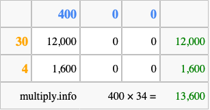 That's all there is to it! As you can see from the box above, the answer to 400 times 34 using the box method is 13,600.