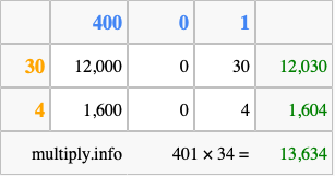 Finally, we add up all the sums we found in step 3 to get our final answer to 401 times 34.