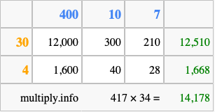 Below is an illustration showing you how to calculate 417 times 34 using the box method, using the instructions above.