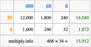 Finally, we add up all the sums we found in step 3 to get our final answer to 468 times 34.
