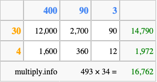 Finally, we add up all the sums we found in step 3 to get our final answer to 493 times 34.
