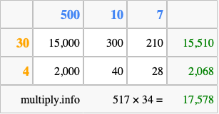 Below is an illustration showing you how to calculate 517 times 34 using the box method, using the instructions above.