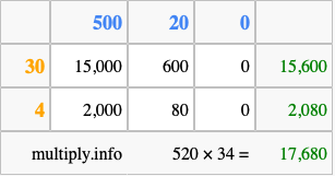 Finally, we add up all the sums we found in step 3 to get our final answer to 520 times 34.