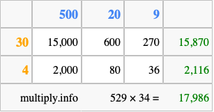 That's all there is to it! As you can see from the box above, the answer to 529 times 34 using the box method is 17,986.