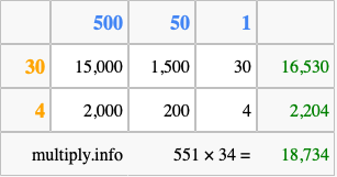 Below is an illustration showing you how to calculate 551 times 34 using the box method, using the instructions above.