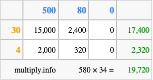 Finally, we add up all the sums we found in step 3 to get our final answer to 580 times 34.
