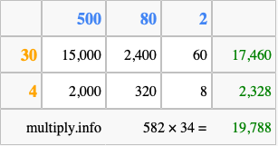 Finally, we add up all the sums we found in step 3 to get our final answer to 582 times 34.