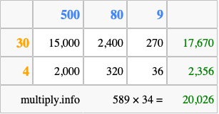 Finally, we add up all the sums we found in step 3 to get our final answer to 589 times 34.