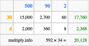 Finally, we add up all the sums we found in step 3 to get our final answer to 592 times 34.