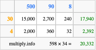 Below is an illustration showing you how to calculate 598 times 34 using the box method, using the instructions above.