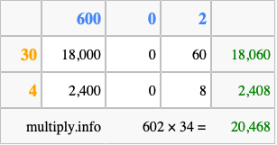 Finally, we add up all the sums we found in step 3 to get our final answer to 602 times 34.