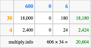 Finally, we add up all the sums we found in step 3 to get our final answer to 606 times 34.