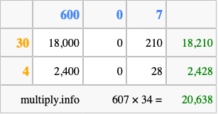 Finally, we add up all the sums we found in step 3 to get our final answer to 607 times 34.
