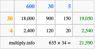 Finally, we add up all the sums we found in step 3 to get our final answer to 635 times 34.