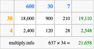 Below is an illustration showing you how to calculate 637 times 34 using the box method, using the instructions above.