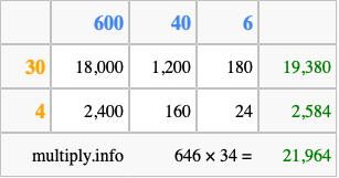 That's all there is to it! As you can see from the box above, the answer to 646 times 34 using the box method is 21,964.
