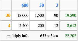 Finally, we add up all the sums we found in step 3 to get our final answer to 653 times 34.