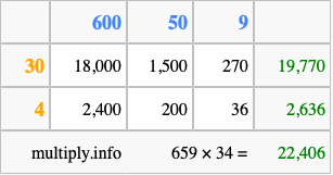 Finally, we add up all the sums we found in step 3 to get our final answer to 659 times 34.