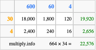 That's all there is to it! As you can see from the box above, the answer to 664 times 34 using the box method is 22,576.