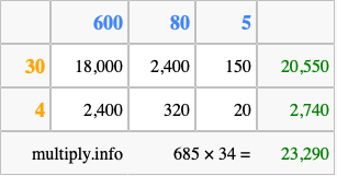 Finally, we add up all the sums we found in step 3 to get our final answer to 685 times 34.