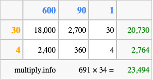 Finally, we add up all the sums we found in step 3 to get our final answer to 691 times 34.