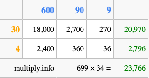 Finally, we add up all the sums we found in step 3 to get our final answer to 699 times 34.
