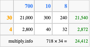Finally, we add up all the sums we found in step 3 to get our final answer to 718 times 34.