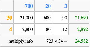 Finally, we add up all the sums we found in step 3 to get our final answer to 723 times 34.