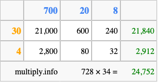 Finally, we add up all the sums we found in step 3 to get our final answer to 728 times 34.