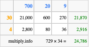Finally, we add up all the sums we found in step 3 to get our final answer to 729 times 34.