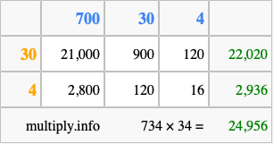 That's all there is to it! As you can see from the box above, the answer to 734 times 34 using the box method is 24,956.