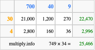 Finally, we add up all the sums we found in step 3 to get our final answer to 749 times 34.