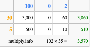 Finally, we add up all the sums we found in step 3 to get our final answer to 102 times 35.
